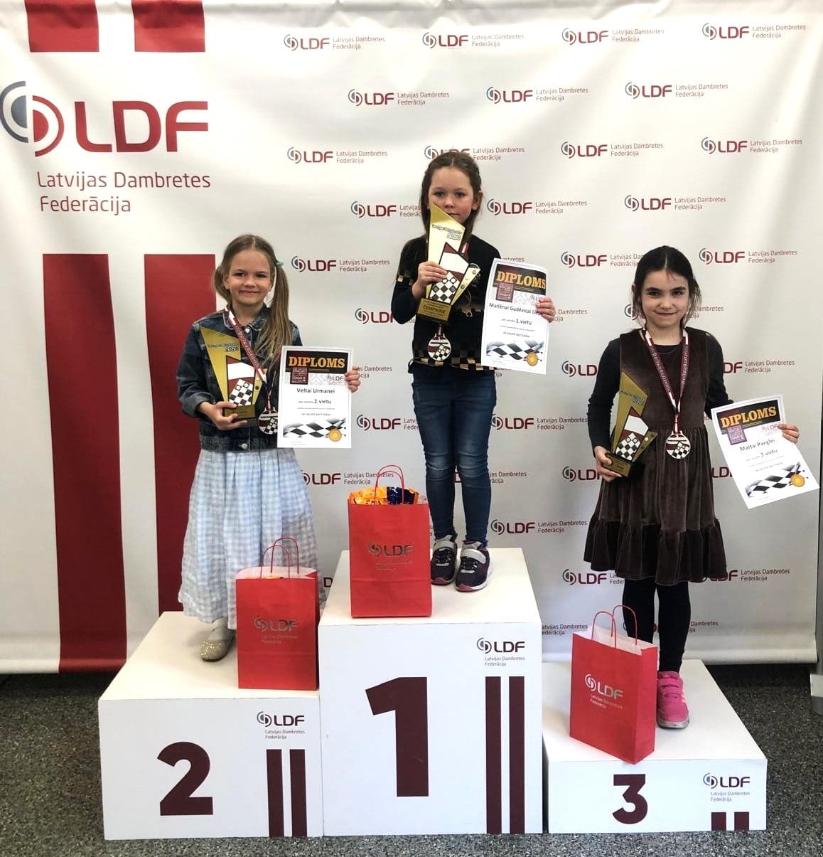 Meiteņu konkurencē startēja 17 jaunās dambretistes. Ar izcīnītajiem 14 punktiem Latvijas čempiones titulu un zelta medaļu izcīnīja Marlēna Gudēvica Liepiņa. Tikpat punktu, bet sliktāki papildu rādītāji ierindoja otrajā vietā Veltu Urmani, viņai sudraba medaļa. Trešajā vietā ar iegūtajiem 11 punktiem ierindojās un bronzas medaļu saņēma Marta Paegle.